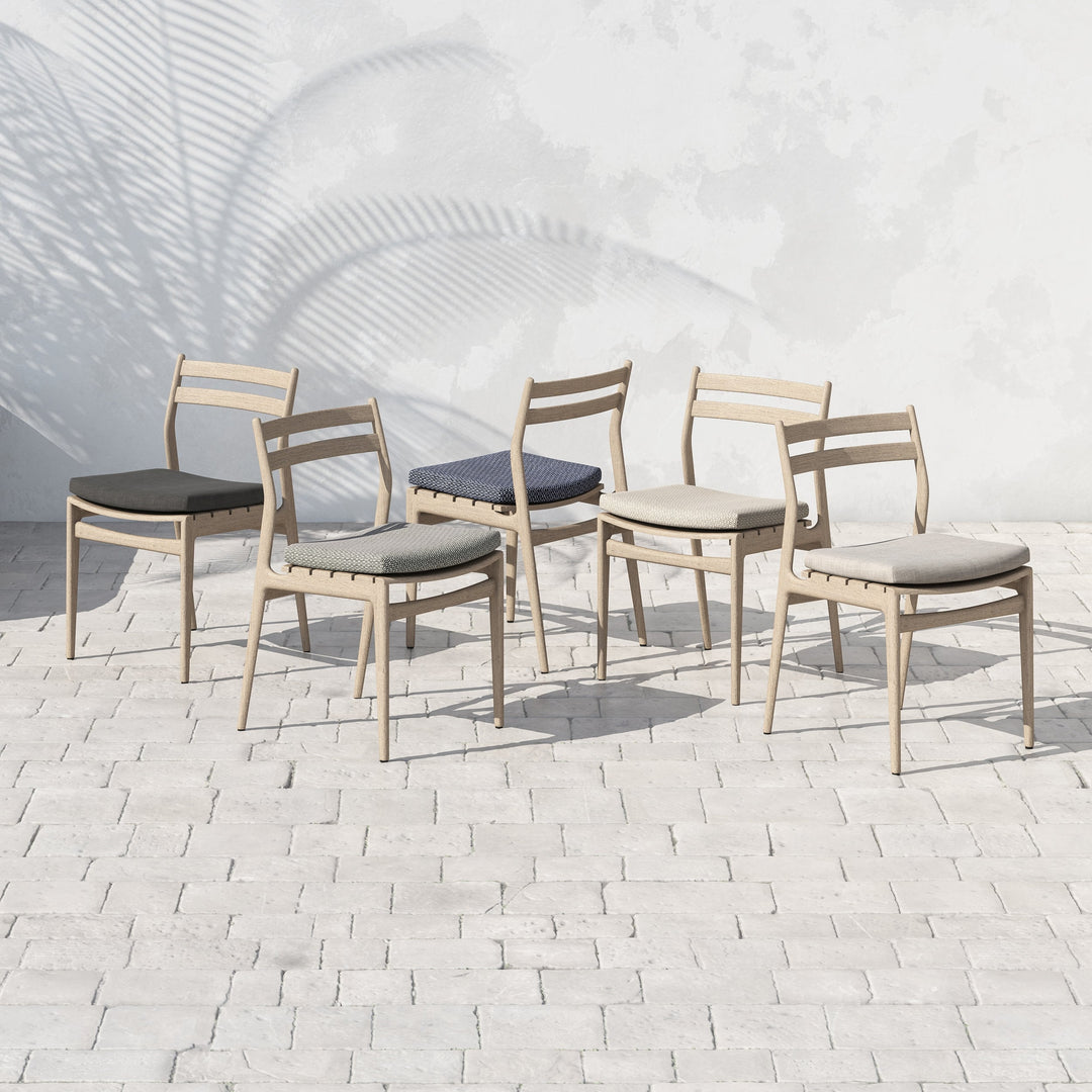 Modern materials ready a streamlined silhouette for the outdoors. Weathered grey or brown teak supports UV-resistant and water-repellant Sunproof seating in an inviting stone grey. Safe for outdoor spaces. Cover or store indoors during inclement weather and when not in use.