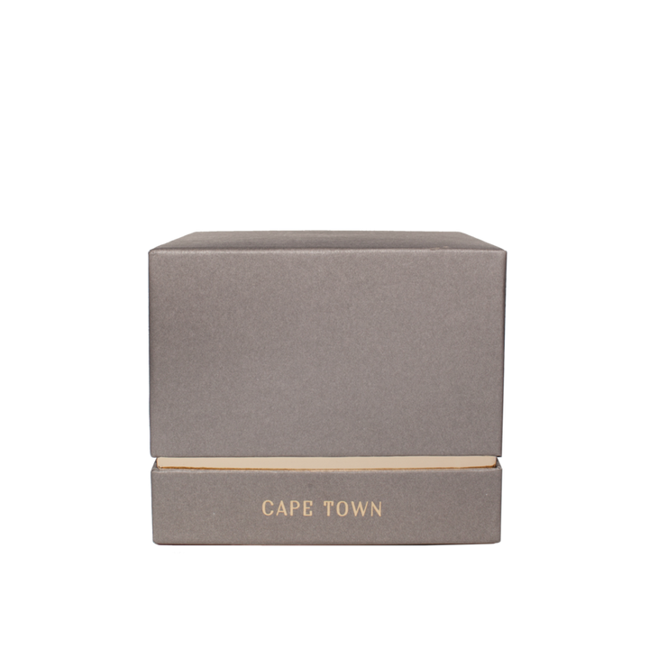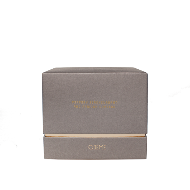A hand-poured double wick candle with a scent of peppery black currant and African Cypress. Housed in an oversized glass vessel.