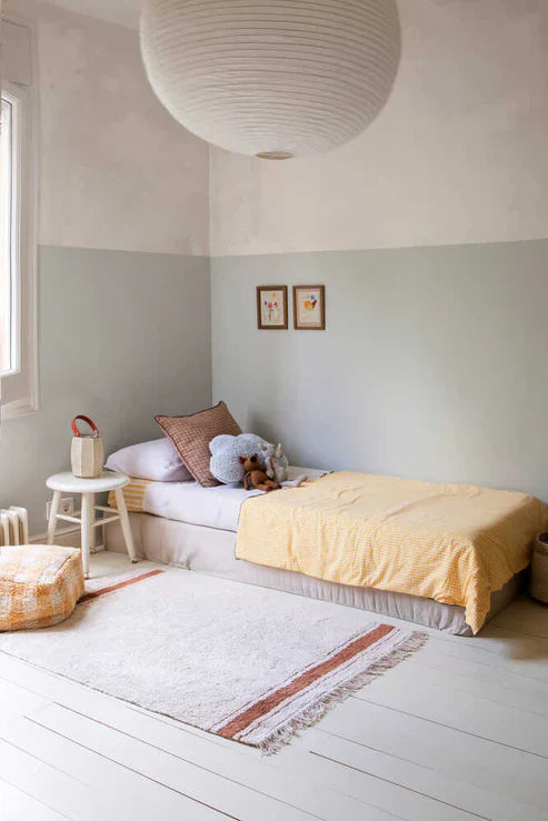 From the kitchen to the rug! Lorena has whipped up a design inspired by a classic striped tea cloth with just a hint of color in vintage hues over a neutral background. A basic piece that can easily blend into any space of your home or add a hint of culinary-themed decor to your little chef’s play corner.